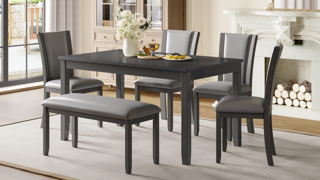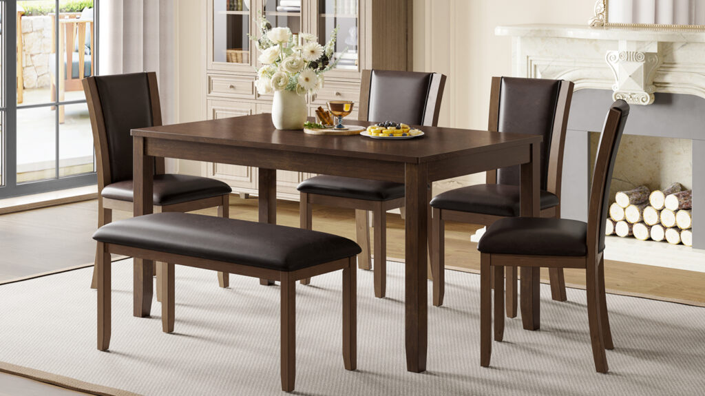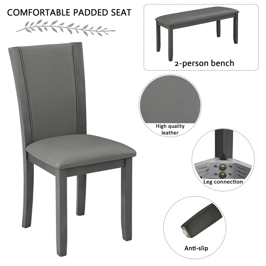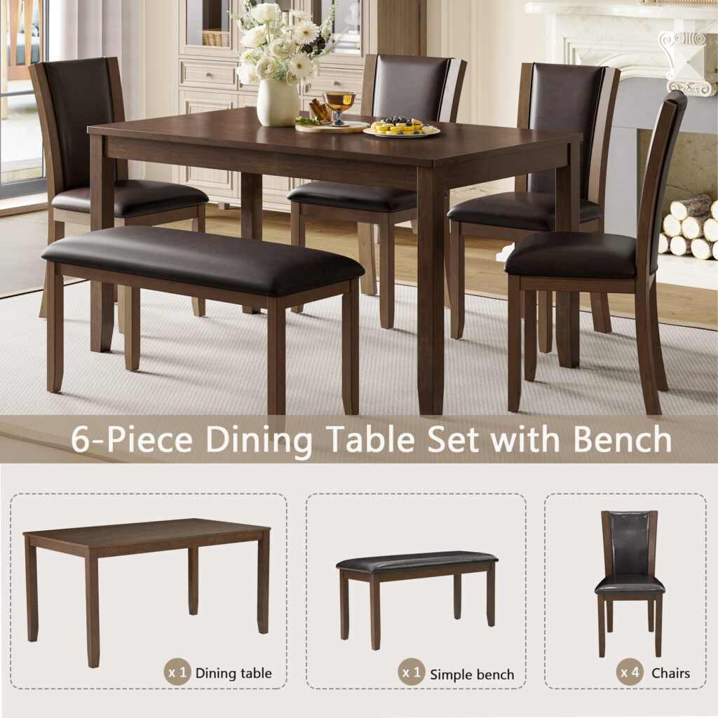6-Piece Wooden Dining Table Set for 4-6, 58.5″ Kitchen Table with 4 Upholstered Faux Leather Chairs and A Bench Set for Dining Room